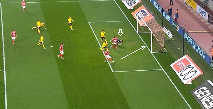 На 64-й минуте армеец Зделар руками прихватил оренбуржца Гойковича в момент подачи стандарта. Насколько контакт был крепким и насколько Гойкович «дорисовал» нарушение – вопрос дискуссионный. А вот то, что мяч летел именно в ту зону, где шла борьба за позицию между этими игроками, абсолютно бесспорно.