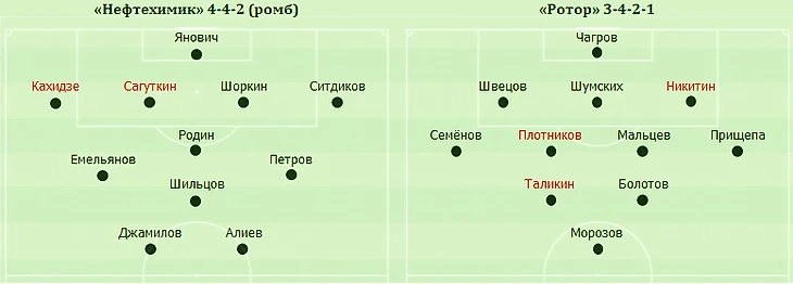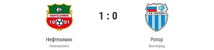 Гол: Джамилов, 3. «Нефтехимик» (Нижнекамск): Янович, Кахидзе, Шоркин, Сагуткин, Ситдиков, Петров (Валиахметов, 90+1), Родин, Шильцов (К.Морозов, 78), Емельянов, Джамилов (Першин, 85), Алиев (Магомедов, 46). «Ротор» (Волгоград): Чагров, Швецов, Никитин (Соколов, 32), Шумских (Мухин, 66), Семенов, Мальцев, Плотников (Шильников, 46), Прищепа, Болотов, Таликин (Тюрин, 46), В.Морозов. Наказания: Швецов, 9. Першин, 88. Тюрин, 90+1. Валиахметов, 90+1 (предупреждения). Судья: Опейкина (Сочи). 4 августа. Нижнекамск. Стадион «Нефтехимик». 1872 зрителя.