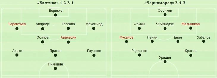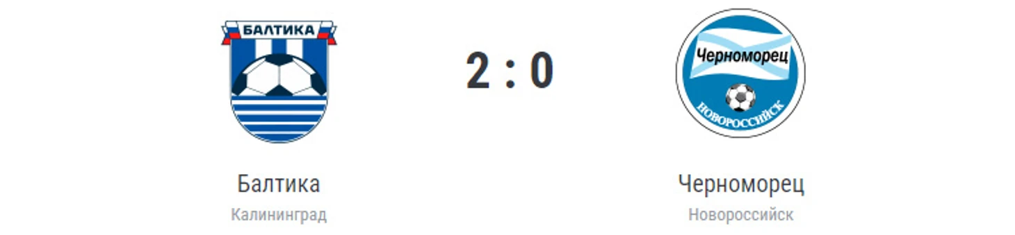 Голы: Алекс, 13 – с пенальти (1:0). Алекс, 39 (2:0). «Балтика» (Калининград): Бориско, Терентьев, Андраде, Гассама, Мохаммад (Ковалев, 71), Осипов, Аванесян, Алекс (Саусь, 58), Пряхин (Маляров, 87), Глушков (Петров, 87), Никишин (Эльдарушев, 58). «Черноморец» (Новороссийск): Фролкин, Мельников (Иванов, 46), Чичинадзе, Фомин, Мусалов (Гурченко, 66), Енин, Ланин, Хабалов (Красильниченко, 75), Кротов (Окладников, 72), Родионов (Антонов, 66), Уридия. Наказания: Фернандес, 18. Мельников, 22. Ланин, 68. Аванесян, 90+4 (предупреждения). Судья: Панин (Дмитров). 2 августа. Калининград. Стадион «Ростех Арена». 11 297 зрителей.