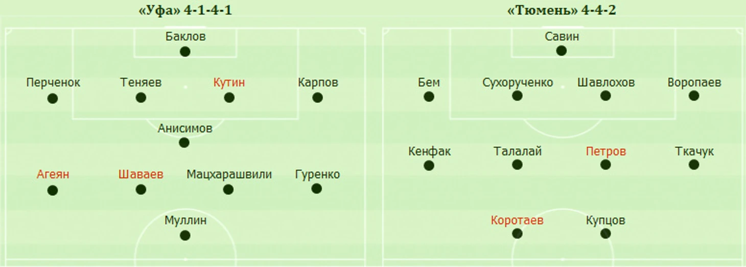 Ближе к перерыву «Уфа» пришла в себя, заиграла агрессивно. Да так, что прямую красную карточку за фол последней надежды получил защитник «Тюмени» Давид Шавлохов. А перед самым окончанием первого тайма хозяева сократили отставание в счёте. Артём Гуренко прострелил с левого фланга в штрафную, мяч прилетел к Алихану Шаваеву, и полузащитник «Уфы» пробил в правый от себя угол. «Тюмень» выручил вратарь, однако на подборе оказался Мигран Агеян и мощным ударом направил мяч в сетку.