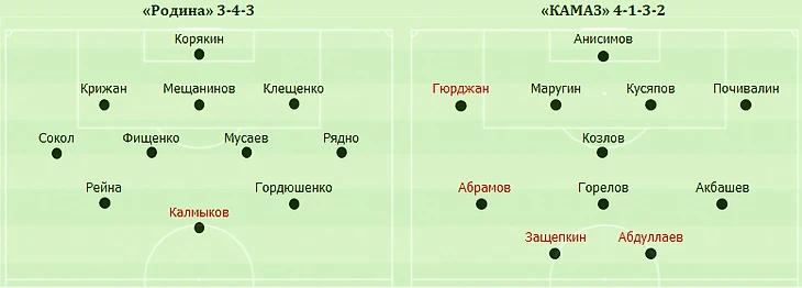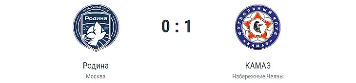 Гол: Караев, 89. Нереализованный пенальти: Акбашев, 37 (вратарь). «Родина» (Москва): Корякин, Сокол (Шадринцев, 70), Клещенко, Крижан, Мещанинов, Рядно (Шайхтдинов, 79), Фищенко, Мусаев, Гордюшенко, Рейна (Данилин, 80), Калмыков (Юшин, 59). «КАМАЗ» (Набережные Челны): Анисимов, Почивалин, Маругин, Кусяпов, Гюрджан, Абрамов (Апеков, 72), Козлов, Горелов (Дерюгин, 90+1), Акбашев (Ратников, 73), Абдуллаев (Фартуна, 77), Защепкин (Караев, 74). Наказания: Маругин, 16. Гюрджан, 36. Рейна, 62. Мусаев, 82. Клещенко, 90+1 (предупреждения). Судья: Жабченко (Краснодар). 4 августа. Москва. Стадион Академии «Спартак» имени Ф.Ф.Черенкова». 687 зрителей.