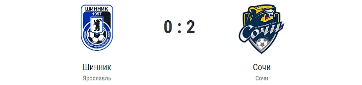 Голы: Марсело, 18 (0:1). Барт, 55 (0:2). «Шинник» (Ярославль): Вамбольт, Косогоров, Загре, Черный, Шакуро (Лаук, 76), Сухомлинов (Фофана, 57), Куль (Якушевич, 58), Алейников, Султонов (Зинков, 58), Жамалетдинов (Малахов, 46), Самойлов. «Сочи»: Карабашев, Заика, Марсело, Литвинов, Магаль, Макаров (Суслов, 74), Начо, Левин (Лазарев, 61), Барт (Крамарич, 74), Гуарирапа, Никитин (Макарчук, 61). Наказания: Сааведра, 11. Косогоров, 16. Самойлов, 87 (предупреждения). Судья: Фролов (Москва). 4 августа. Ярославль. Стадион «Шинник». 2501 зритель.