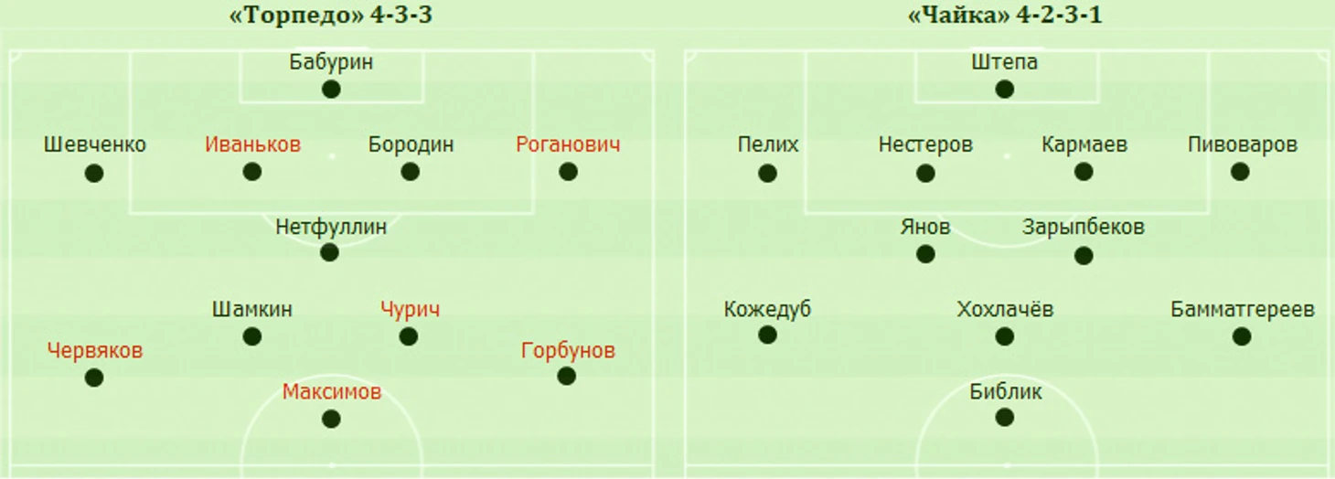Открытый футбол в первом тайме показали обе команды. Чуть поинтересней действовали торпедовцы, но это не помогло им повести в счете. Более того, они несколько минут находились в роли отыгрывающихся поле того, как мяч попал в руку их опорнику Равилю Нетфуллину и за это был назначен пенальти. Восстановить статус-кво торпедовцам удалось очень быстро: Руслан Червяков, за счет высокой стартовой скорости регулярно переигрывавший своего визави на правом фланге атаки, сделал верховую подачу, мяч свалился у него с ноги и по непредсказуемой для вратаря «Чайки» траектории рикошетом от дальней штанги спланировал в сетку.