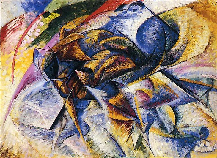 Как и другие футуристы, Боччони писал о стремительном мире, который поглощен прогрессом и скоростью (ее символом стал первый автомобильный бум). Делать по старинке реалистично уже нельзя, поэтому даже футболиста Боччони изображает как сотню переплетенных хаотичных движений. Мы можем лишь ухватить детали и представить, что это футболист.