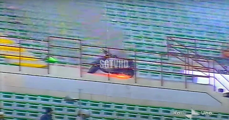 Возможно, вы помните: два фаната сбрасывают с трибуны скутер, который падает между сиденьями и, к счастью, не травмирует зрителей. Судя по кадрам, болельщики внизу готовы скутеродопаду, поэтому и отходят в сторону.