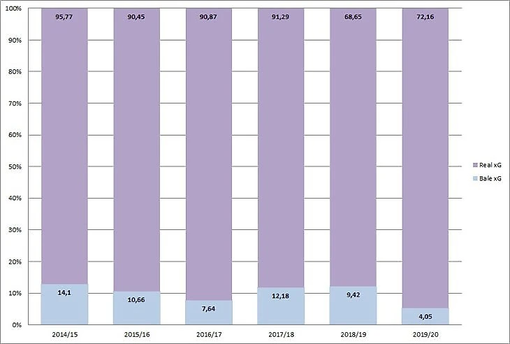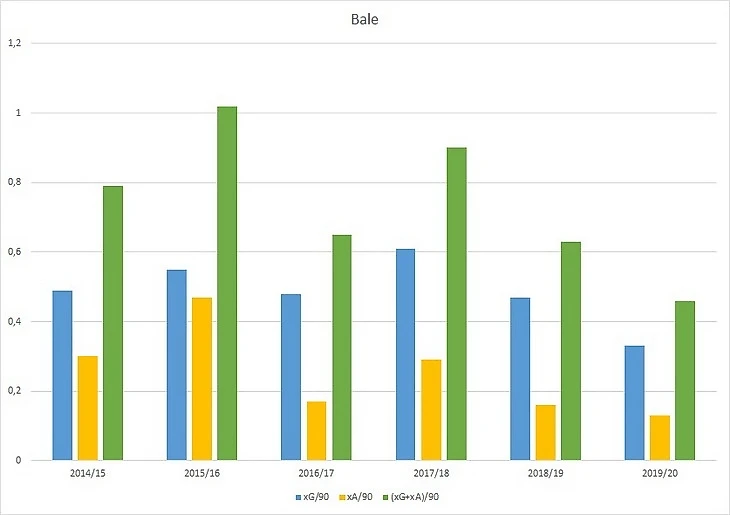 Падение цифр в последних сезонах можно объяснить: в сезонах 2016/17 и 2019/20 Бэйл провел на поле меньше 1500 минут, а в сезонах 2018/19 и 2019/20 «Реал», в целом, создавал намного меньше чем раньше. При этом на долю Бэйла стабильно приходилось 12-15%. Исключением стали сезоны 2016/17 и 2019/20, в которых он играл меньше всего.
