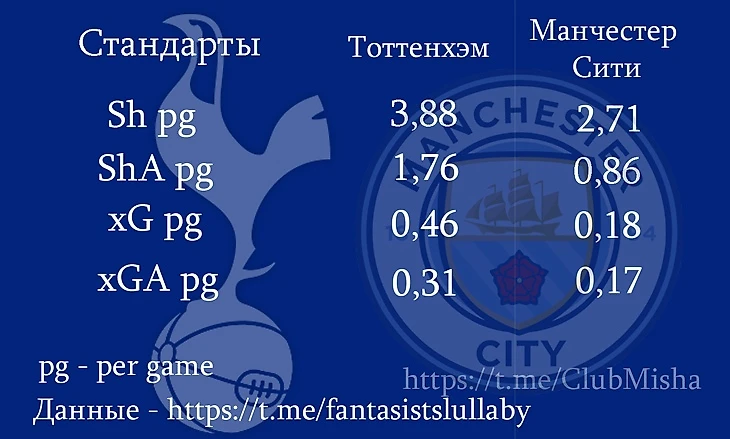 С одной стороны, у «Тоттенхэма» очень опасные стандарты у чужих ворот: они и больше всех в лиге били после стандартов, и создали больше остроты (xG). С другой, по стандартам у своих ворота «Тоттенхэм», – одна из худших команд лиги. Больше ударов после стандартов допустила только «Астон Вилла», а по остроте допущенных ударов «шпоры» 15-е. У «Сити» полностью обратная ситуация: одни из лучших на стандартах у своих ворот и не слишком опасны у чужих.