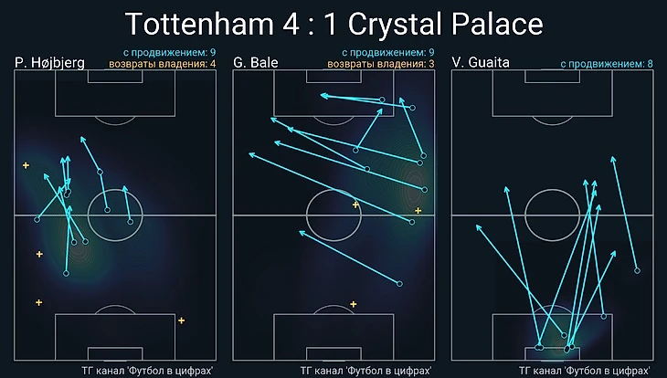 У Бэйла и Кейна показатели оборонительных действий схожие и невысокие. В больших матчах или там, где придется много отрабатывать в обороне, меньшая вовлеченность сразу двух игроков может привести к серьезным проблемам. Недавний матч с «Фулхэмом» в этом плане очень показательный. Команда Скотта Паркера не прижималась, больше владела мячом и после перестроений в перерыве стала быстро доставлять мяч на левый фланг атаки (в итоге 45% атак провели через эту зону). «Тоттенхэм» чудом не пропустил и смог исправить ситуацию, только уйдя в позиционную оборону после замен, когда Сиссоко и Моура вышли вместо Деле и Бэйла.