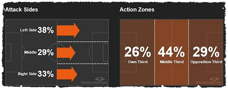 В этом сезоне команда сделала крен на левый фланг (38%, 33% через правый фланг и 29% через центр), что вполне объяснимо. Если брать основную пару защитников Роуз-Уокер, то подключения Данни опаснее и несут в себе больше угрозы. Ситуация менялась, когда на поле появлялся Триппьер, у которого кроссы гораздо острее, чем у Уокера, несмотря на прогресс последнего.