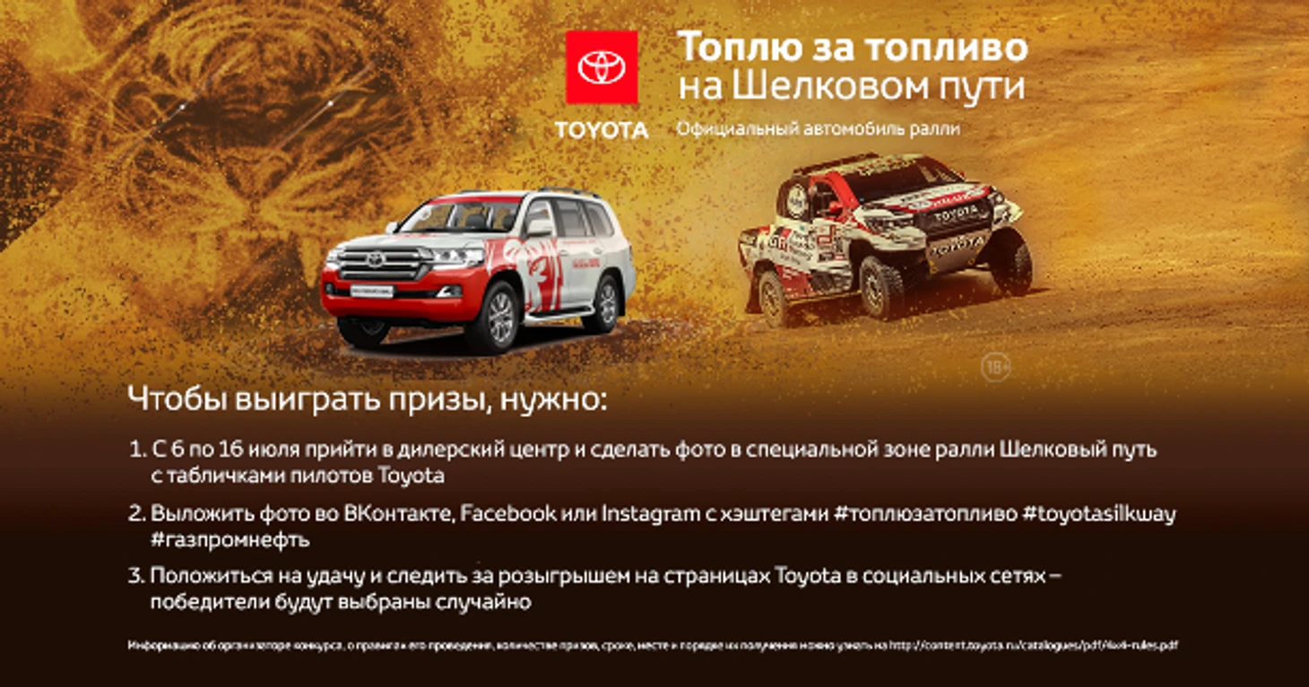 Помимо горючего, вы можете выиграть еще и один из трех фанатских наборов: они состоят из статуэтки «Шелкового пути», рюкзака с автографами лучших раллистов «Тойоты» и приветственной карты от «Газпромнефти». Более того, в каждый день «Шелкового пути» «Тойота» выбирает самую креативную фотографию и награждает автора толстовкой из собственной коллекции