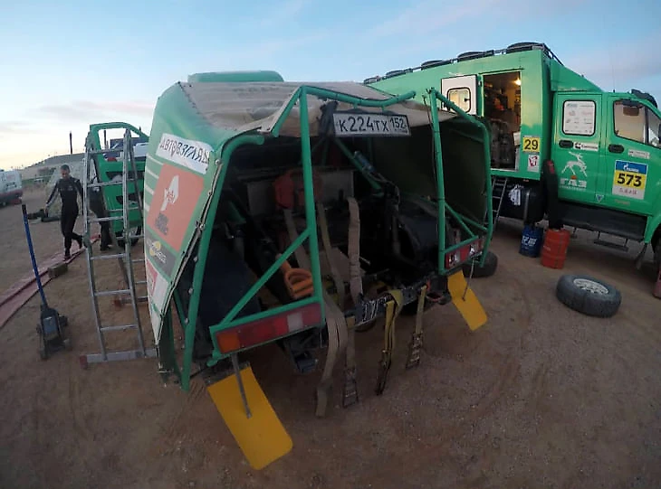 – гонщик из топ-3 общего зачета внедорожников Матье Серрадори влетел в большой камень, скрытый песками, и разворотил подвеску. К слову, в предыдущий пустынный день его багги заглох на лиазоне после финиша соревновательного отрезка — француза на бивуак дотащил пилот «КАМАЗа» Сергей Куприянов