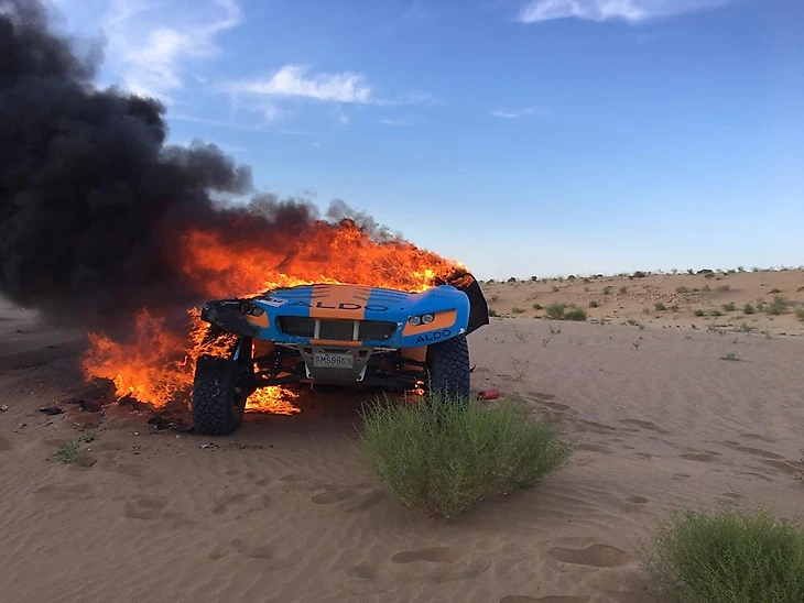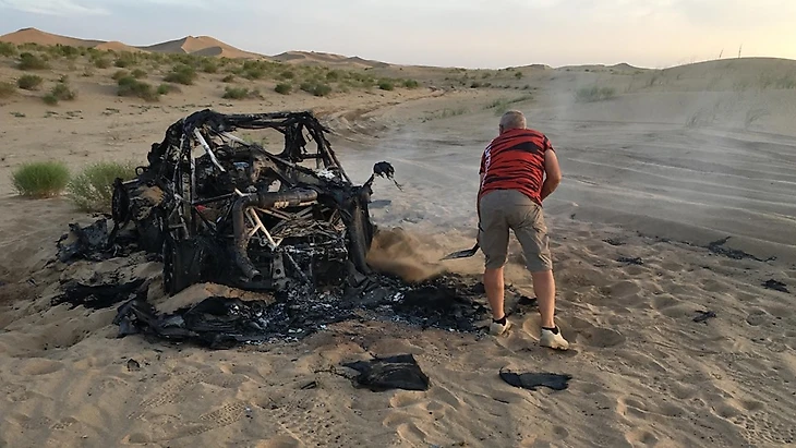 Поскольку шины тоже сгорели, и у машины не осталось колес, выгоревший остов не так-то просто оказалось загрузить на эвакуатор. Экипажу пришлось 13 часов мариноваться в пустыне без еды — спасли только местные с вяленой верблюжатиной. Она, кстати, канадцам не понравилась.