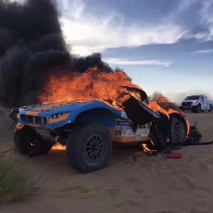 По рассказу гонщика, пламя сочилось из моторного отсека. Два огнетушителя и бортовая система не помогли: багги выгорел за считанные минуты