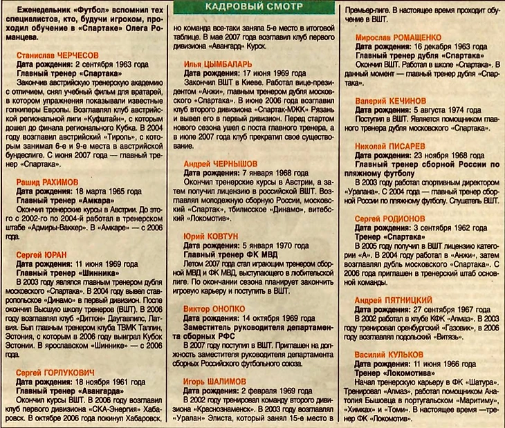 Лето 2007-го: еженедельник «Футбол» проводит всероссийскую перепись «учеников» Олега Романцева, в разное время впитавших на подкорке его легендарные «квадраты» и «максималку», фирменные «стеночки-забегания» и принцип верховенства «одного касания».