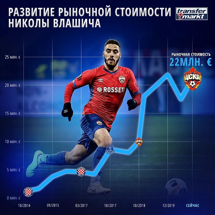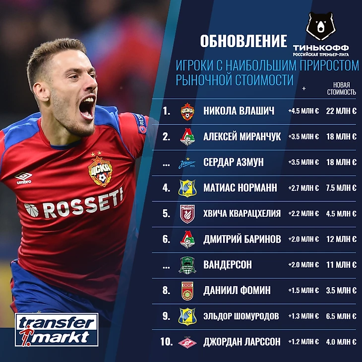 Больше всех подорожал Никола Влашич, его стоимость выросла на 4,5 млн евро и вернется к его прежнему максимуму до пандемии в 22 млн евро. Это самый большой прирост рыночной стоимости в РФПЛ. Такой рост стоимости обозначен тем, что Влашич в этом сезоне был системообразующим игроком ЦСКА и даже мог в одиночку решить исход матча. К тому же он находится в очень хорошем возрасте и к нему проявляют интерес клубы из европейских чемпионатов. Таким образом, он сравнялся с Марио Фернандесом, который до этого момента был самым ценным игроком ЦСКА.