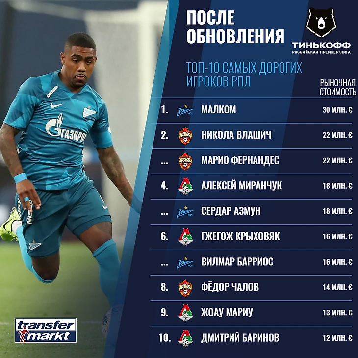 Если считать прирост стоимости в процентах, то победителем рейтинга будет Константин Марадишвили. В концовке сезона полузащитник ворвался в основу ЦСКА и заслужил +300% к ценнику. Теперь его стоимость составит 1 млн евро. Фёдор Чалов провёл не лучший сезон, но потерял лишь 500 тыс. евро. Всё-таки у форварда неплохая статистика (8 голов, 8 голевых передач), ему всего 22 года, да и клубы за рубежом проявляют к нему интерес. Матвей Сафонов, наоборот, наберёт полмиллиона евро. Голкипер «Краснодара» был стабилен и заслужил небольшого повышения стоимости. Самым дорогим игроком РПЛ по-прежнему останется Малком. Бразилец провёл неплохую концовку чемпионата, но слишком уж долго восстанавливался после травмы. Поэтому его стоимость снизится с 30,5 млн евро до 30 млн евро.