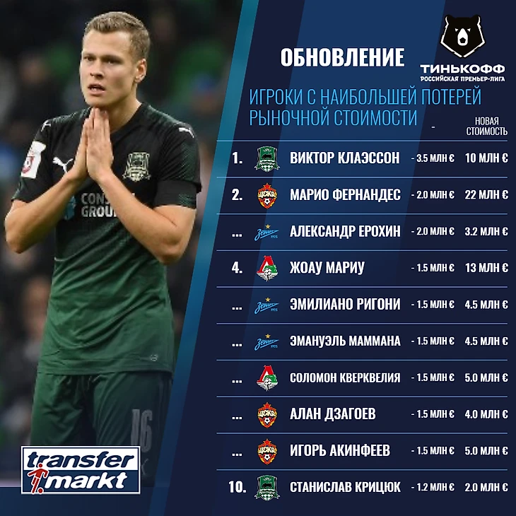 Также стоит отметить понижение стоимости Александра Ерохина на 2 млн евро. Связано это также с возрастом игрока, которому в этом году исполняется 31 год, а также потеря места в стартовом составе. На 1.5 млн евро упала стоимость сразу шестерых игроков РПЛ. Связано это, в первую очередь, либо с затяжными травмами, как в случае Мамманы и Дзагоева, во-вторых, возраста как у Игоря Акинфеева, или потеря места в стартовом составе, как у Соломона Квирквелии и Ригони. Жоау Мариу потерял 1.5 млн евро в стоимости из-за не столь стабильной игры во второй части сезона, а также из-за готовности «Интера» расстаться с игроком за 12-13 млн евро. Также как и у Марио Фернандеса тут произошла фактическая адаптация к реалиям рынка. Больше же всех в стоимости потерял вингер «Краснодара» Виктор Классон. Из-за разрыва «крестов» игрок сборной Швеции провёл весь сезон в лазарете и не смог восстановиться даже к концовке сезона, пропустив, таким образом, больше года. Его стоимость упала на 3,5 млн евро до 10 млн евро. Также из-за повышенной травматичности в этом сезоне и малого игрового времени 1 млн евро в стоимости потерял француз Кабелла. Он теперь также оценивается в 10 млн евро.