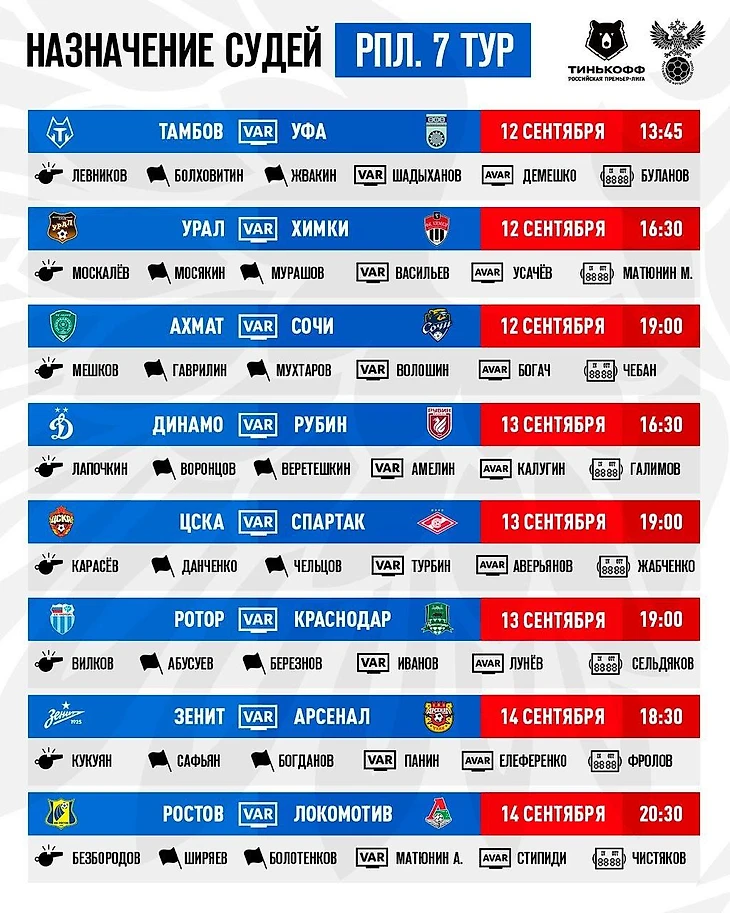 И вот назначения на 7 тур. И мы видим, что Сухой действительно не судит. А чего ему судить, он же не арбитр ФИФА, в отличие от Москалева. А Москалёв опять работает (опять!). У меня объяснение только одно, которое я уже озвучивал перед финалом Кубка России. Владимир — арбитр ФИФА. Негоже таких мариновать на лавке. Европа не поймёт, не так глянет.