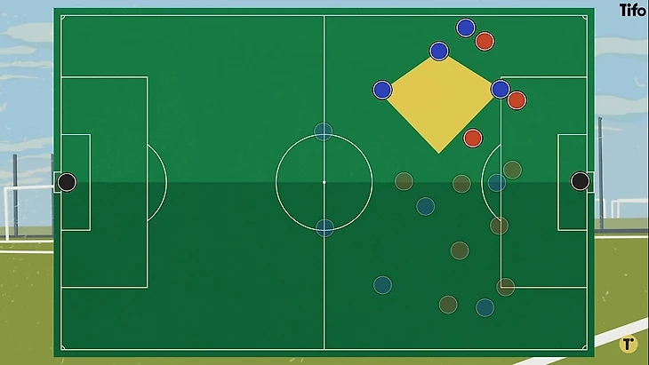 Используя концепцию гибкого футбола игроки будут менять свое положение несколько раз. Например, если игроки, располагающиеся в основании ромба пересекают левую зону по ширине, то правая зона займет в свою очередь основание, а игроки, располагающиеся в левой зоне переместятся в правую зону, таким образом сохраняя форму и гарантируя доступные варианты продвижения мяча.