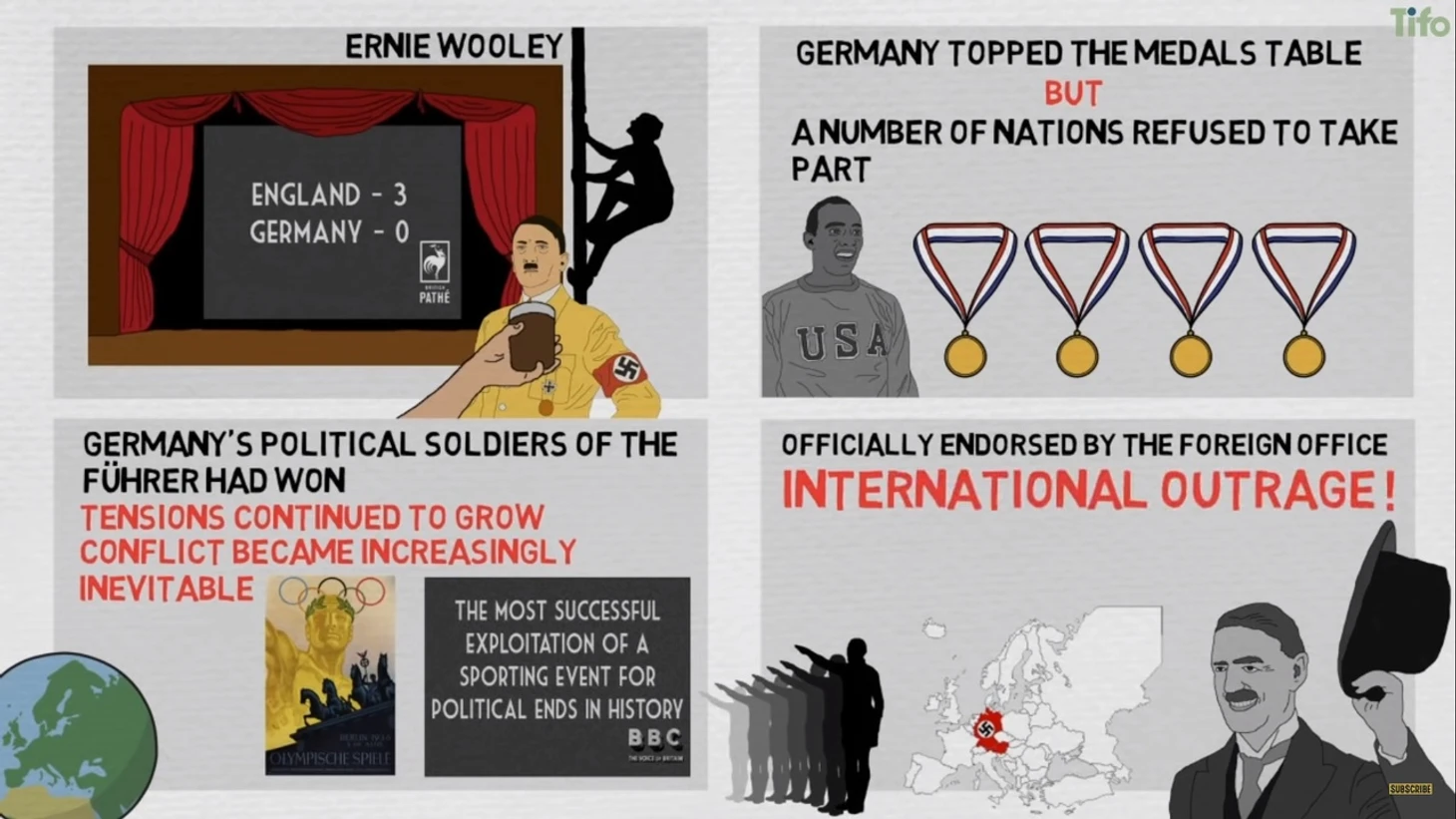 Поскольку напряженность продолжала расти, а конфликт становился все более неизбежным, Гитлер стремился перенести импульс, стоящий за его политикой, на глобальную арену, так как Берлин принимал Олимпийские игры 1936 года. Согласно документальному фильму BBC "Фашизм и футбол", это было "наиболее успешное использование спортивного мероприятия для политических целей в истории". Но, несмотря на то, что страна-организатор заняла первое место в медальном зачете, её текущее положение не полностью соответствовало задуманной стратегии. В спортивном мероприятии, известном также участием большим количеством стран, отказавшихся от участия - темнокожий спортсмен из США Джесси Оуэнс опроверг нацистский нарратив и завоевал четыре золотые медали.