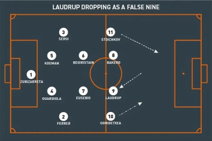 Лаудруп был футболистом с потрясающим чувством позиции. Больше привыкший к роли ассистента и обладающий отменным умением передачи, чем к забиванию голов, он обладал идеальными качествами для позиционного стиля игры, которого так желал Кройф. Роль ложной девятки требовала, чтобы Лаудруп покидал зону центрального нападающего, где он начинал игры, чтобы он мог играть вместе с атакующими полузащитниками — чаще всего с Эусебио Сакристаном, Чики Бегиристайном и Хосе Мари Бакеро — или с вингерами, что вызывало путаницу у соперников, так как центральные защитники больше привыкли играть / часто были нацелены на игру против традиционных центральных нападающих. Динамичные движения, которые требовались от ложной девятки, и возникающий в результате этого дисбаланс в оборонительных линиях соперника также позволили полузащитникам легко занимать отличные позиции для ударов.