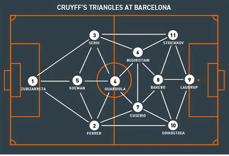 Владение мячом само по себе не интересовало Кройфа. Он хотел, чтобы его игроки понимали, что для того, чтобы удержать мяч и двигаться к воротам соперника, его нужно постоянно двигать. Это было ключом к созданию дисбаланса в структуре соперника и образованию пространств, которые позволили бы им проникнуть в опасные зоны.