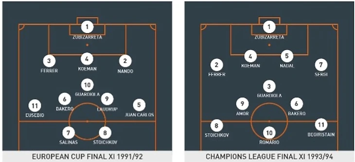 Это не означало, что роль центрального нападающего была полностью исключена — в последующие сезоны Кройф использовал таких результативных бомбардиров, как Ромарио и Хулио Салинаса. Последний играл в стартовом составе вместе с Христо Стоичковым в финальной победной игре Кубка европейских чемпионов 1992 года над Сампдорией, проходившей на Уэмбли, а Лаудруп действовал позади них.