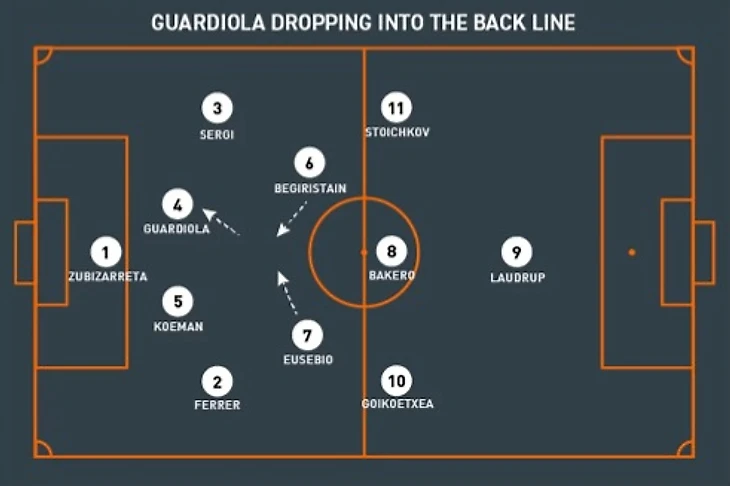Если команда изначально играла по схеме 4-3-3, с двумя центральными защитниками, опорный полузащитник был в центральной зоне поля, которая была естественной для его игры. Это можно увидеть в команде Кройфа, а именно команде финала Лиги чемпионов 1994 года против Милана, где Гвардиола располагался глубоко в полузащите, перед Куманом и Надалем.