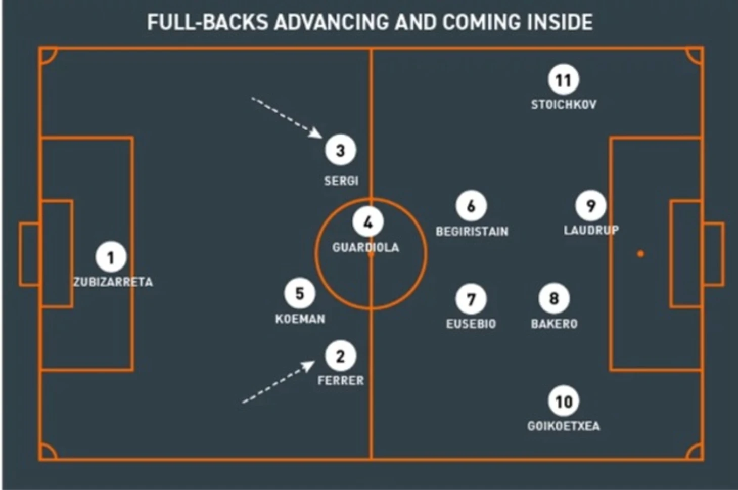Однако так было не всегда — Кройф хотел, чтобы его крайние защитники имели возможность смещаться в центральные зоны. Это не только давало бы больше пространства для атакующих игроков, но обеспечивало центральному полузащитнику больше возможностей для передачи игроку, находящемуся поблизости.