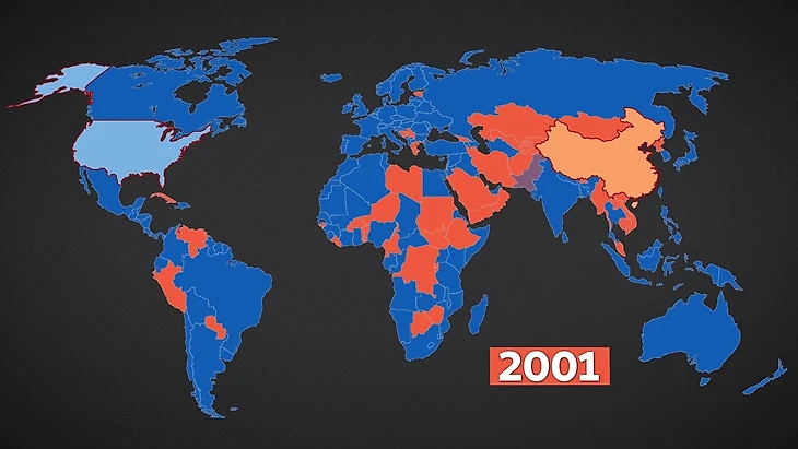 На этой карте отражено сравнение двух экономических сверхдержав: США и Китая, с точки зрения торговли. Синие страны больше торгуют с США, а красные - с Китаем. Приведены данные по состоянию на 2000 год.