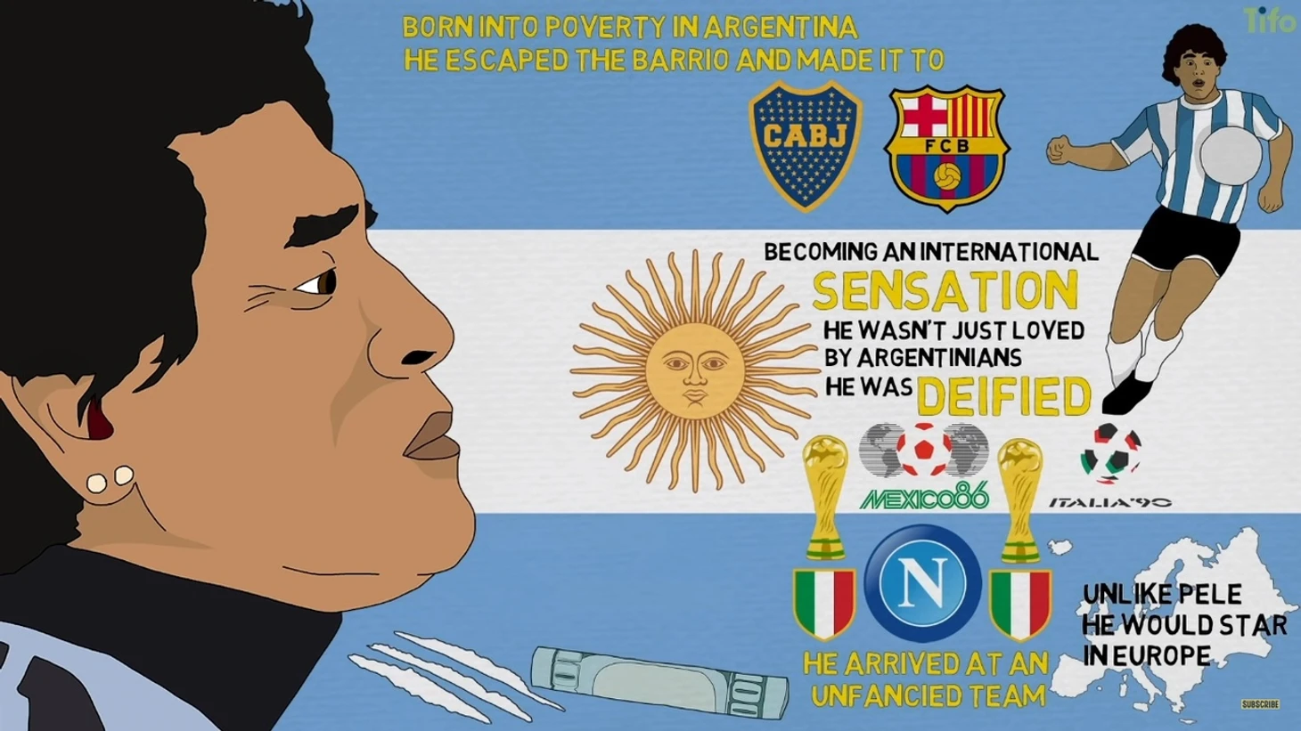 Марадона, возможно, был первой суперзвездой современного футбола. Родившись в Аргентине и проведя детство в окружающих его бедных условиях, он сбежал из баррио в Бока Хуниорс, а затем в Барселону, став поинцы, егводом для международной сенсации. Его любили не только аргенто обожествляли по всему миру. Он, практически в одиночку выиграл для своей страны Чемпионат мира 1986 года, почти повторив подвиг в Италии 1990 года. В отличие от Пеле, он также стал звездой в Европе, особенно в Наполи, где он попал в неприметную команду и был обожаем за то, что принес её два скудетто. Но кокаин был его слабостью. Скандал за скандалом разрушали его карьеру.