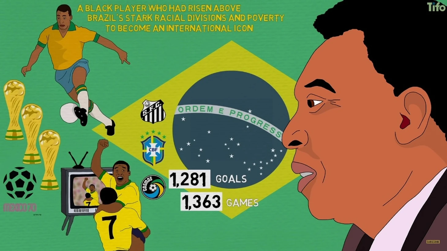 Пеле, возможно, был первой футбольной суперзвездой мирового уровня, чернокожим игроком, который, несмотря на расовые различиям и бедность Бразилии стал международной иконой. Он выиграл три Чемпионата мира, в том числе заполучил культовый титул 1970 года в Мексике. Это был первый финал, который транслировался по телевидению в прямом эфире и в цветном формате. На его счету рекордные 1281 гола, забитых в 1363 играх за Сантос, а затем и за Нью-Йорк Космос. Он был джентльменом, чей талант превосходил всё остальное.