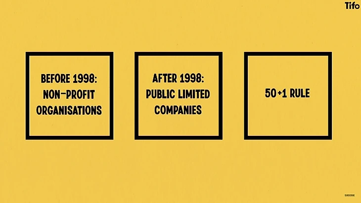 Удачная ситуация, но для Баварии, некоторые из подобных преимуществ достались системным трудом - спортивными достижениями, относительной политической стабильностью, и, в том числе, за амбиции - их реализацию, необычную для представителей клуба. До 1998 года немецкие футбольные клубы функционировали как некоммерческие организации. После реформ, произошедших в том же году, им было разрешено управлять своими футбольными подразделениями в форме (публичных компаний, акционерных компаний — акционерных обществ, акции которых обращаются на фондовом рынке свободно, без ограничений), при этом единственным ограничением для частных инвестиций было правило 50+1, которое гарантирует, что полный контроль над клубом остается в руках его членов.
