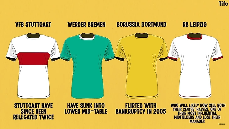 С 2000 года только четыре других клуба выиграли Бундеслигу. С тех пор, Штутгарт - один из них, дважды опускался в низшую лигу, Вердерчасто закреплялся в середине таблицы, а Боруссия при всех своих недавних успехах, в 2005 году была на грани банкротства, и в наши дни, шмели вынуждены часто продавать своих лучших игроков. Как и РБ Лейпциг, близкий (в сезоне 2020-21) к уровню Баварии футбольный клуб, который после такого продаст обоих своих центральных защитников, одного из своих самых влиятельных полузащитников и потеряет своего менеджера.