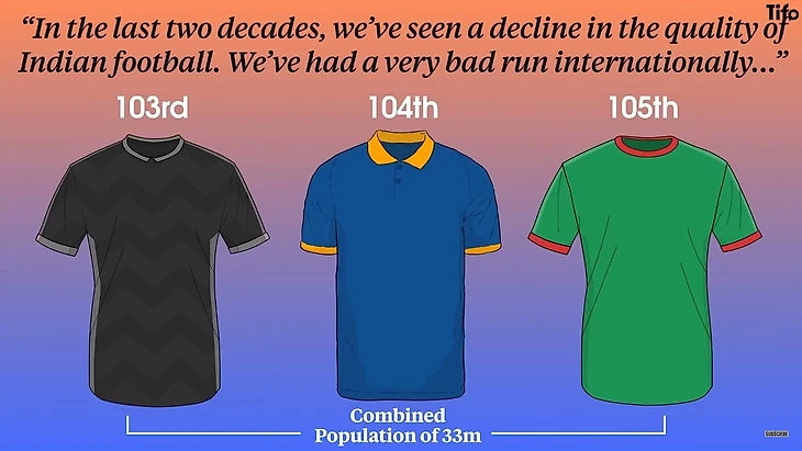 По словам индийского журналиста, окружающий контекст также является проблемой. "За последние два десятилетия мы наблюдаем снижение качества индийского футбола. У нас очень плохие результаты на международном уровне", — говорит он в заявлении, подкрепленном недавним рейтингом ФИФА, в котором Индия находится на 104-м месте, и располагается между Новой Зеландией и Мадагаскаром - странами с общим населением всего 33 миллиона человек.