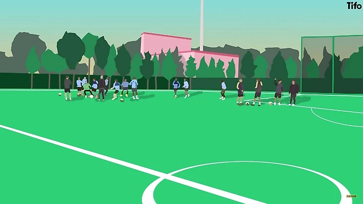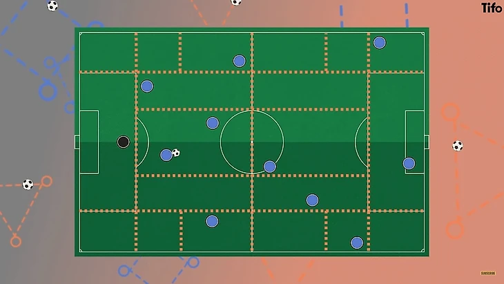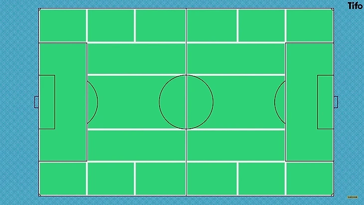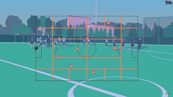 Обучение позиционной игре — хорошее место для понимания сути. Многим известно знаменитое и разделенное на зоны тренировочное поле Пепа Гвардиолы, которое демонстрирует один из ключевых строительных блоков этого метода.