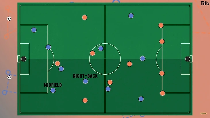 Численное превосходство заключается количественном преимуществе игроков Вашей команде, что позволяет с легкостью передавать мяч вокруг и мимо соперников. Хорошим примером этого является ситуация владения вратарем мячом и расхождением центральных защитников, с опусканием в освободившуюся зону опорного полузащитника. Это означает, что даже против трех защитников соперника, прессингующих эту площадь, у команды, владеющей мячом будет свободный игрок.