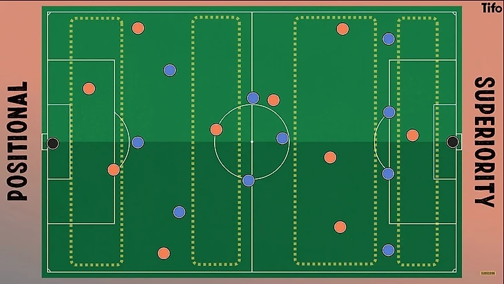 Позиционное превосходство — это открытие дополнительных игроков между линиями прессинга или в рядах обороны соперника. Оно должно позволить игрокам иметь больше времени и пространства с мячом, чтобы сделать качественный пас и не потерять мяч. Оно достигается за счет того, что игроки занимают определенные зоны поля - как по вертикали, так и по горизонтали, и именно поэтому Гвардиола использует расчерченное тренировочное поле.