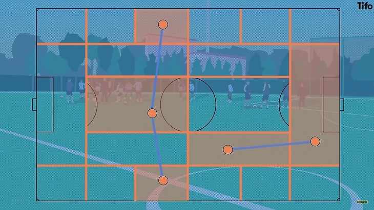 Тренировочное поле разделено на отдельные зоны вертикальными и горизонтальными линиями. Это было сделано для того, чтобы игроки могли изучать свои движения в определенных зонах, и за их пределами. На одной горизонтальной линии не должно располагаться более трех игроков или двух на одной вертикальной линии — вот почему, например, если крайний защитник смещается в центр, то вингер убегает на фланг, и наоборот. Игроки должны автоматически знать, где и когда находиться - в зависимости от того, где идет игра, где находится мяч и где находятся их товарищи по команде.
