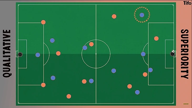 Качественное превосходство — это попытка дать одному из сильных игроков команды (в плане дриблинга и игры один в один) возможность свободно играть против защитника, который не так хорош в таких ситуациях - он, возможно, медленный, слабый или менее техничный. Этого можно добиться растяжением игровой зоны, с целью изоляции крайнего защитника и быстрого нападающего, чтобы при переключении (перед кроссом или ударом), нападающий мог свободно атаковать этого защитника.