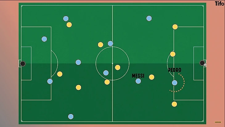 Когда Гвардиола использовал Лионеля Месси в качестве ложной девятки, эффект был таков, что либо Месси сам находился в пространстве между линиями, добиваясь позиционного превосходства и часто оказываясь третьим игроком, либо, если за ним следовал центральный защитник, то пространство открывалось для третьего игрока, которым зачастую выступал фланговый нападающий.