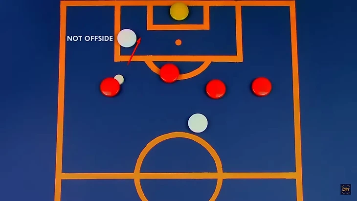 Во-вторых, положение мяча и игрока относительно друг друга; игрок не находится в офсайде до тех пор пока он находится перед линией мяча.
