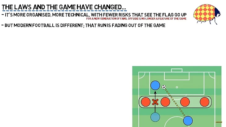 Сейчас изменились правила, в том числе и сама игра. Футбол стал более организованным, более техничным видом спорта - с меньшими рискованными амбициями атакующих игроков, которые могли бы сопровождать поднятие флага. Для нового поколения болельщиков офсайд уже не особенность игры, а баг (ошибка в игровой системе).