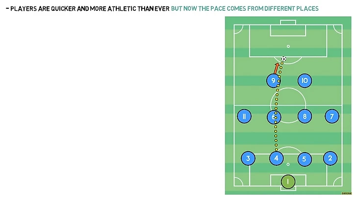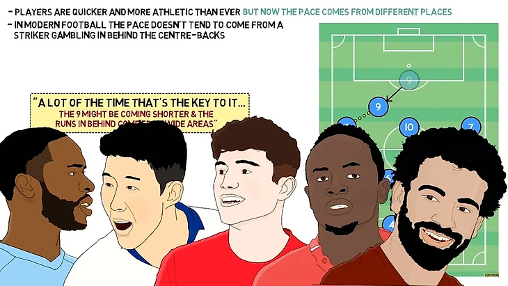 В современном футболе скоростные забегания, как правило, не зависят от нападающего, играющего прямо за центральным защитником. «Часто это является ключом к успеху», — отмечает один из тренеров Премьер-лиги. «Игра девятого номера становится глубже, а забегания все чаще происходят из широких областей». Рахим Стерлинг, Сон Хын Мин, Садио Мане и Мохамед Салах — лучшие примеры, но у большинства команд Премьер-лиги теперь есть фланговые игроки, которые делают забегания из глубины.