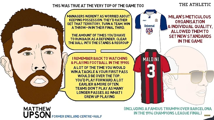 Подвергаются значительным изменениям методы игры как в нападении, так и в защите. Офсайд-ловушка в свое время была необходимой защитой. «Я помню, как играл и наблюдал за футболом периода 1990-х годов», — говорит Мэттью Апсон, бывший центральный защитник сборной Англии. «Во многих случаях когда вы отбирали мяч, то следующий сразу за этим пас был наиболее вероятным действием. Вы бы играли вперед намного раньше и чаще. Сейчас команды не делают так много длинных пасов сразу после возврата владения, как в те времена, когда я вырос. Помню, в молодежной команде «Лутона» много внимания уделялось акценту на смене фаз игры», — вспоминает Апсон.
