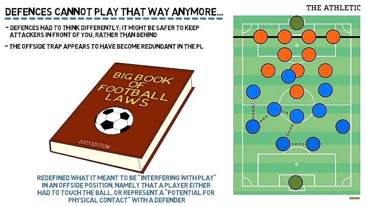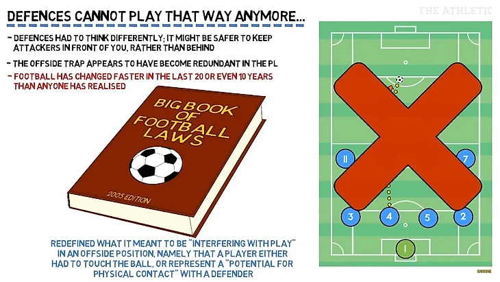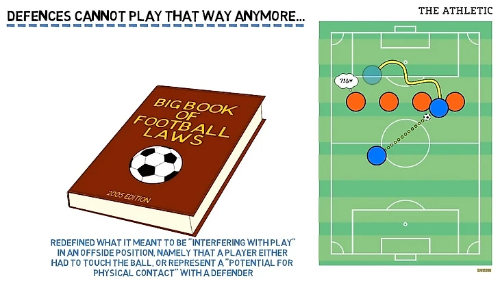 Но защита больше не может так играть. Изменения в правилах 2005 года поменяли определение того, что означает «вмешательство в игру» в положении «вне игры», а именно: игрок должен был либо коснуться мяча, либо представить «возможность физического контакта» с защитником.