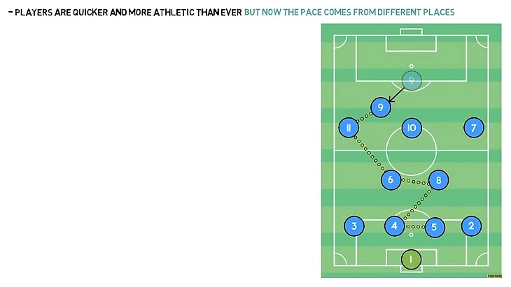 Тем не менее, большинство из тех, кто смотрит современный футбол, не сказал бы, что у игры значительно снизился темп. Игроки стали быстрее и физически сильнее чем когда-либо, но теперь темп игры имеет множество источников. Защитники долго не расстаются с мячом, чтобы центральный нападающий в «мании прессинга» преследовал их. Вместо этого нападающие, которые скорее всего играют в рамках схем 4-3-3 или 4-2-3-1, исполняя роль девятки, опускаются ниже и хотят, чтобы мяч попадал им прямо в ноги. Это очень отличается от игры в рамках традиционной схемы 4-4-2 и в целом английской игры.