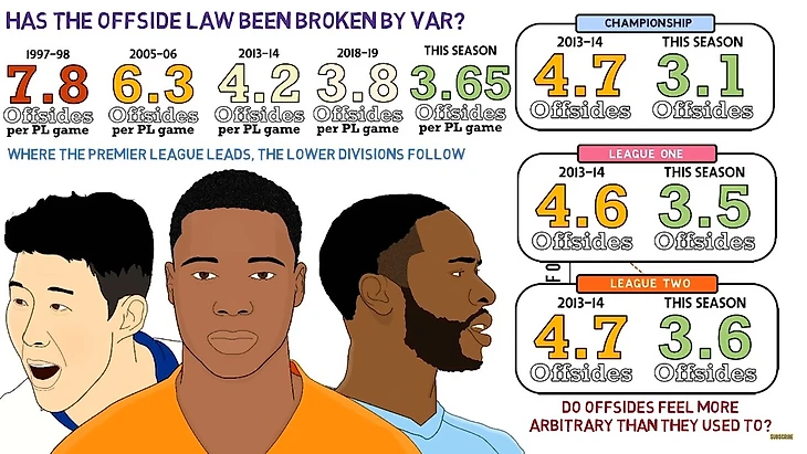 В 2018 году он был всего 3,8. В 2019 и далее, тенденция продолжилась - с падением показателя до значения 3,65. Там, где лидирует Премьер-лига, за ней следуют и её низшие дивизионы. В чемпионшипе количество офсайдов снизилось с 4,7 за игру в сезоне 2013/14 до 3,1 в 2018 году. В первой лиге с 4,6 в сезоне 2013/14 до 3,5 в 2019. Во второй лиге с 4,7 в сезоне 2013/14 до 3,6 в 2019 году.