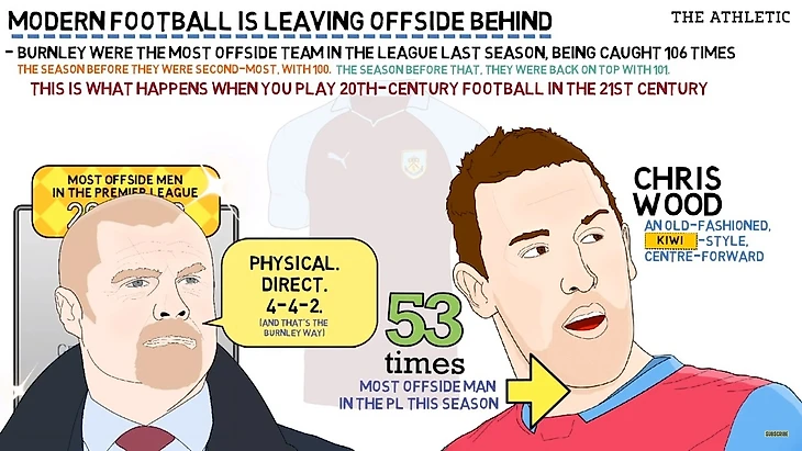 Они также были командой с наибольшим количеством офсайдов в лиге в сезоне 2018/2019 гг. - на счету игроков Бернли оказалось 106 попаданий в положение вне игры. В сезоне 2017/2018 они были вторыми по результативности со 100 офсайдами. В сезоне 2016/2017 снова на вершине со 101 офсайдами. Вот что происходит, когда в 21-м веке играют в футбол 20-го века. Поэтому неудивительно, что Вуд — центральный нападающий старомодного английского стиля в сезоне 2019/2020 был игроком, чаще всего попадающим в офсайд. Так же, как и в сезоне 2018/2019 - 53 раза, значительно опередив занявшего второе место Гленна Мюррея (38). Он управляет линиями, пользуется свободными каналами, часто делает прямолинейные забегания - он очень хорош в этом.