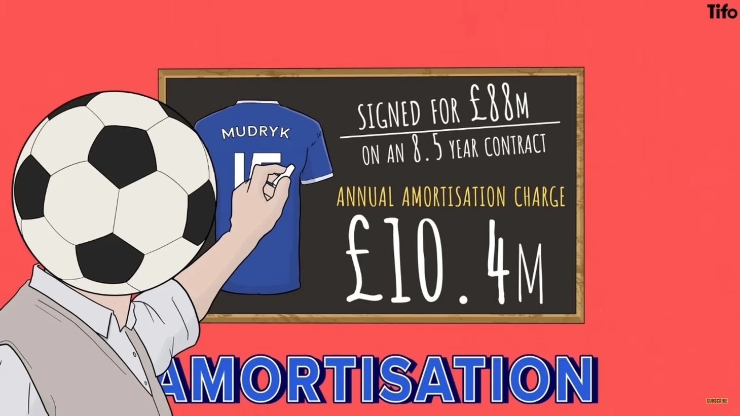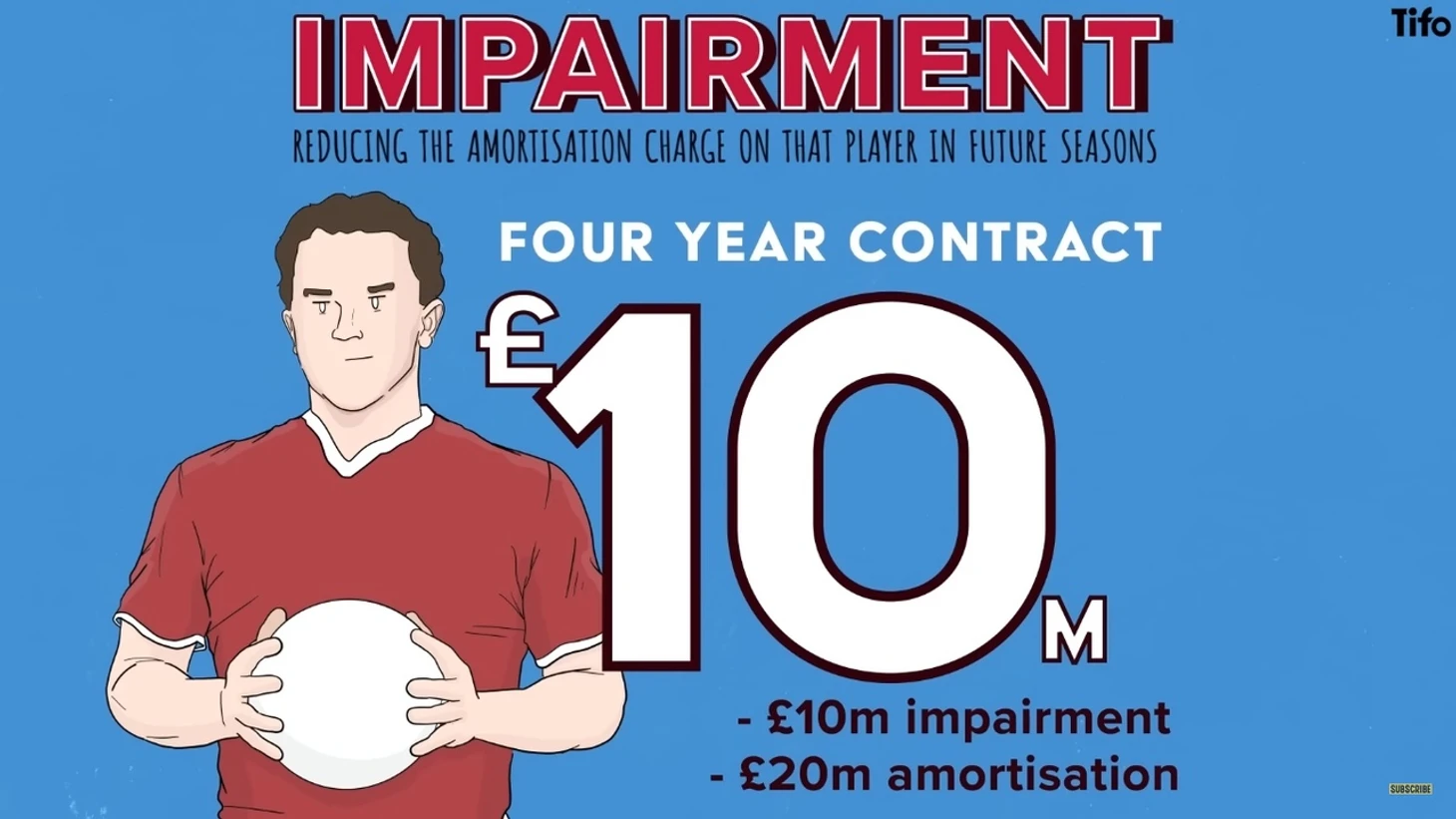 Например, если игрок подписал четырехлетний контракт на сумму 40 миллионов фунтов стерлингов, то амортизационные отчисления составят 10 миллионов фунтов стерлингов в год. Но если после второго года клуб спишет 10 миллионов фунтов из оставшейся стоимости контракта, которая на тот момент составляла бы 20 миллионов, то балансовая стоимость изменится с 20 на 10 миллионов, а амортизационные отчисления в третий и четвертый годы составят 5 миллионов фунтов в год.